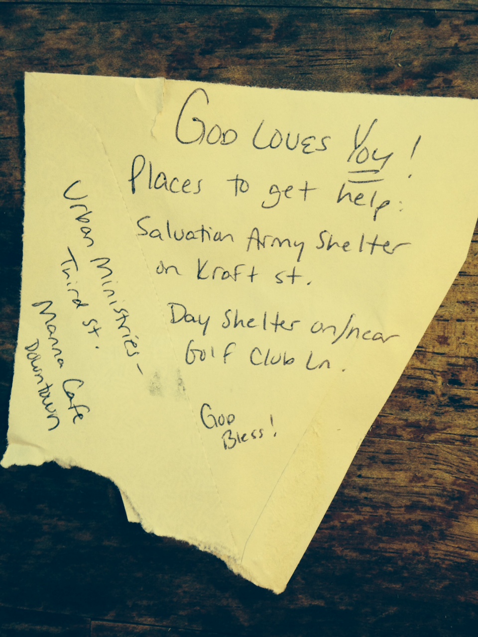 Three people gave me “homeless bags” today (plastic baggies with a toothbrush, socks, baby wipes, etc.)—how great is that? (I’ll pass on whatever I don’t use in the next 11 days to someone who needs them.) This note was inside one of the bags.